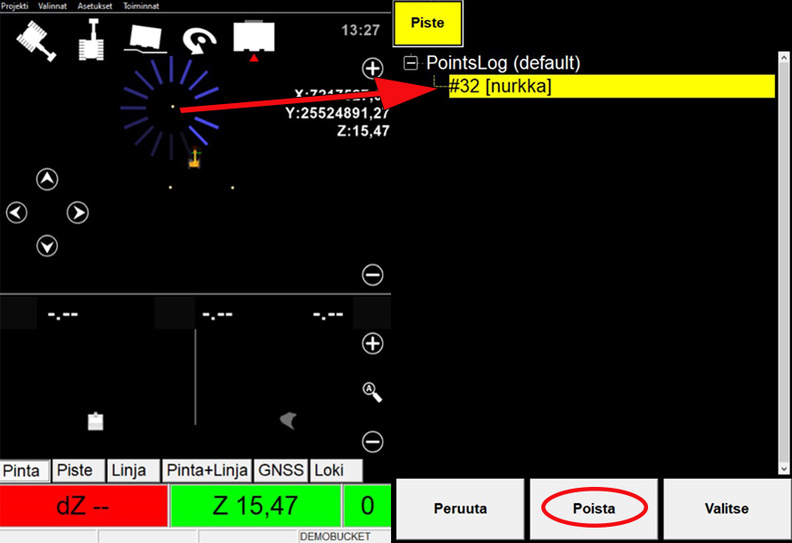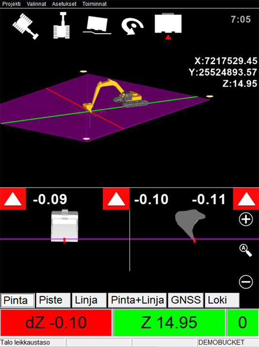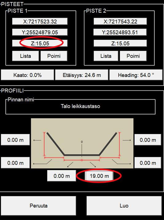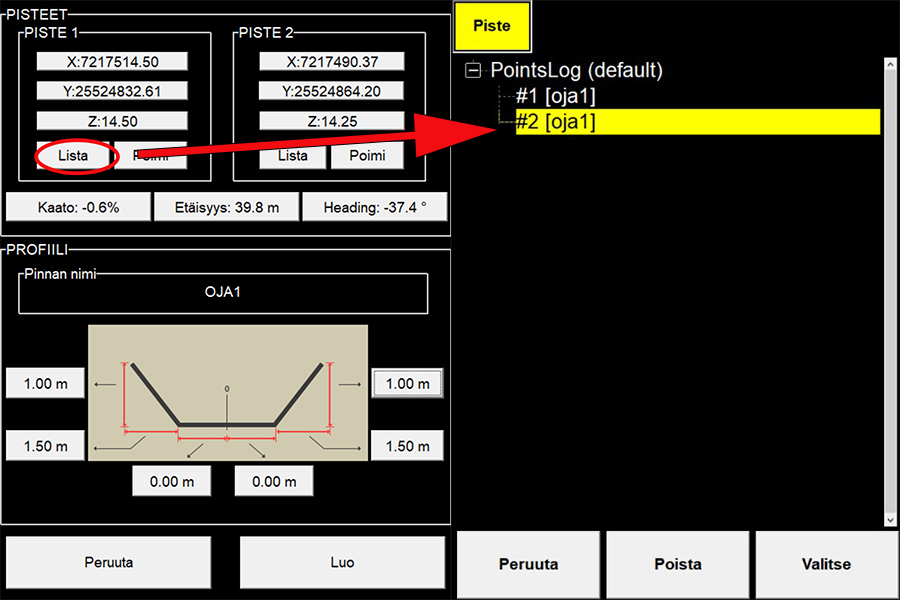Home › Näin luot oman koneohjausmallin Novatronin koneohjausjärjestelmällä LinkedIn Twitter Facebook Näin luot oman koneohjausmallin Novatronin koneohjausjärjestelmällä Tiesitkö, että 3D -koneohjauksesta on hyötyä myös pienemmissä maanrakennustöissä, kuten ojien kaivuussa ja pintojen muotoilussa? Tässä blogitekstissä kerromme vaihe vaiheelta, miten voit itse luoda koneohjausmallin helpottamaan omaa työtäsi. Novatronin Xsite® PRO -koneohjauksen mallinluonti -työkalulla voit itse tehdä yksinkertaiset mallit rakennusten pohjista, ojista, luiskien muotoiluista, rumpujen asennuksesta sekä putkikaivannoista. Yksi asiakkaamme on hyödyntänyt järjestelmäämme jopa laskettelurinteiden muotoilussa! Oman mallin luomiseen tarvitset vain kaksi pistettä, joiden väliin esimerkiksi ojamalli tai talonpohjan malli luodaan. Pisteet voidaan syöttää järjestelmään manuaalisesti, tai ne voidaan mitata suoraan järjestelmällä. Milloin koneohjausmalli kannattaa luoda itse? Koneohjaus nopeuttaa ja helpottaa lähes kaikkea maanrakentamista. Novatronin 3D-koneohjausjärjestelmän mallityökalua voidaan hyödyntää esimerkiksi: Ojien kaivuussa Rakennusten pohjissa Luiskien muotoilussa Putkikaivannoissa Rumpujen asennuksessa Laajemmat ja monimutkaisemmat mallinnukset, kuten väylän rakennekerrokset ovat järjestelmällä vähintäänkin haastavia tehdä, miksi emme sitä suosittele. Emme myöskään suosittele, että työkoneen tuotantotehokkuuden kustannuksella ryhdytään luomaan laajoja malli -kokonaisuuksia. Voit lukea koneohjausmallien tilaamisesta pienemmille työmaille aiemmasta blogitekstistämme. Mitä tietoja oman koneohjausmallin tekemiseen vaaditaan? Oman koneohjausmallin luomiseen vaaditaan vähintään 2 pistettä, joiden väliin esimerkiksi ojamalli tai talonpohjan malli luodaan. Pisteet voidaan syöttää järjestelmään manuaalisesti, tai ne voidaan mitata suoraan järjestelmällä. Oma malli voidaan luoda myös järjestelmään tuoduista pisteistä, esimerkiksi suunnittelijan tekemistä kaivopisteistä. Pisteiden korkotietoa on mahdollista muokata mallin luontivaiheessa. VINKKI: Luodessasi mallia kaivopisteistä, selvitä mikä korkeus kaivoille on annettu, jotta linjamallille määrittyy oikea korkeus ja kallistus. Pienet rakennustyömaat, kuten talojen ja hallien pohjat, ovat otollisia paikkoja järjestelmän mallityökalun hyödyntämiseen: Työmaalle merkatut rakennuksen nurkat voi mitata koneohjausjärjestelmän muistiin työkoneella. Silloin merkkejä ei välttämättä tarvitse sitoa työalueen ulkopuolelle. Rakennusten pohjatyömailla leikkaustason malli voidaan luoda nurkkapisteistä, jos leikkaustason korkeus saadaan määritettyä: Suunnitelmakuvista Sokkelin korkeudesta Tai muusta absoluuttisesta korkeudesta Miten koneohjausmallit luodaan itse? Voit luoda koneohjausjärjestelmällä kolmenlaisia malleja: linja-, piste- tai pintamalli. Pistemalleja ovat yleensä valaisinpylväät sekä kaivot. Yleisimpiä linjamalleja ovat putkilinjat kaivopisteiden välillä, ojat, rummut sekä kaapelit. Pintamallit ovat rakennepintoja, kuten rakennusten pohjat. Seuraavaksi käymme läpi kaksi esimerkkiä kohteista, joissa omaa mallia voi hyödyntää. Ojamallin luominen Tässä esimerkissä teemme koneohjausmallin suorasta ojasta. Mitataan ensin koneohjausjärjestelmällä pisteet ojan keskikohdasta.Näin saamme tulevan ojan pohjan korkeuden: Aseta kauhan mittapiste ojan keskikohtaan. Valitse ”Loki”-välilehti. (Kuva 1) Valitse toinen painike oikealta. (Painikkeessa lukee viimeksi käytetty pisteen koodi) Syötä pisteelle koodi. Esim: oja1. – Valitse ”OK” Valitse ”Tallenna sij.” -Nyt ojan aloituspiste on tallennettu järjestelmään. Siirrä kone ojan päähän. * Aseta kauha ojan keskelle pohjaan, ja paina ”Tallenna sijainti”. -Ojan lopetuspiste on tallennettu järjestelmään. *Jos et ole tekemässä suoraa ojaa, siirrä kone kohtaan, jossa oja tekee taitteen. Jatka näin, kunnes saavutat ojan lopetuspisteen. VINKKI: Jos teet mallin ojasta, jossa on taitekohtia, käytä pisteille koodeja oja1, oja2, oja3 jne. Tämä selkeyttää mallitiedostojen hallintaa järjestelmässä. Kun olet mitannut tarvittavat pisteet, valitse ylävalikosta: 8. Toiminnat -> Luo referenssilinja.9. Valitse ojan pisteet ”Lista”- tai ”Poimi” -toiminnolla. Tässä esimerkissä pisteet valitaan listalta.10. Valitse PISTE 1 -osioon ensimmäisenä tallennettu piste listalta. Sen jälkeen valitse oikeasta alakulmasta ”Valitse”(Kuva 2.)11. Valitse PISTE 2 -osioon toisena tallennettu piste listalta. Sen jälkeen valitse oikeasta alakulmasta ”Valitse”.12. Järjestelmä näyttää nyt valittujen pisteiden koordinaatit, sekä niiden väliin tulevan linjan: Kaadon prosentteina (Kaato: -0.6%) Pituuden (Etäisyys: 39,8 m) Suunnan (Heading: -37,4°) VINKKI:Voit tarvittaessa vielä muokata linjan kaatoprosenttia sekä alku- tai loppupisteen koordinaatteja. 13. Valitse ”Pinnan nimi”, ja nimeä malli, esim. OJA1. (Kuva 3).14. Koska haluamme esimerkissä luoda pintamallin ojasta , määritämme ojan profiileiksi luiskat 1:1,5. Ojan leveys -kohta jätetään arvoon 0.00 m. Halutessasi voit syöttää leveydeksi esim. 0.25 m oikealle ja 0.25m vasemmalle, jolloin ojan pohjasta tulee 0,5 m leveä.15. Tarkasta että tiedot ovat oikein.16. Valitse ”Luo”. Järjestelmä luo tallentamiesi pisteiden väliin linjan ja pintamallin antamillasi arvoilla. Voit nyt valita ojamallin mittaukseen ja aloittaa työt! (Kuva 3.) VINKKI: Jos haluat luoda ojasta vain linjamallin, jätä profiilin mitat syöttämättä/varmista että kaikissa kohdissa on lukema0.00 m. VINKKI: Jos jatkat ojalinjan mallinnusta, anna mallille aina sama nimi, niin saat luotua yhtenäisen pintamallin ojasta. Rakennuksen pohjan luominen Lähtötilanne: Maastoon on merkattu rakennuksen nurkkamerkit. Tallennetaan nurkkamerkit pisteiksi järjestelmään. (Kuva 4.) 1. Aseta kauhan mittapiste nurkkamerkkiin.2. Vali
